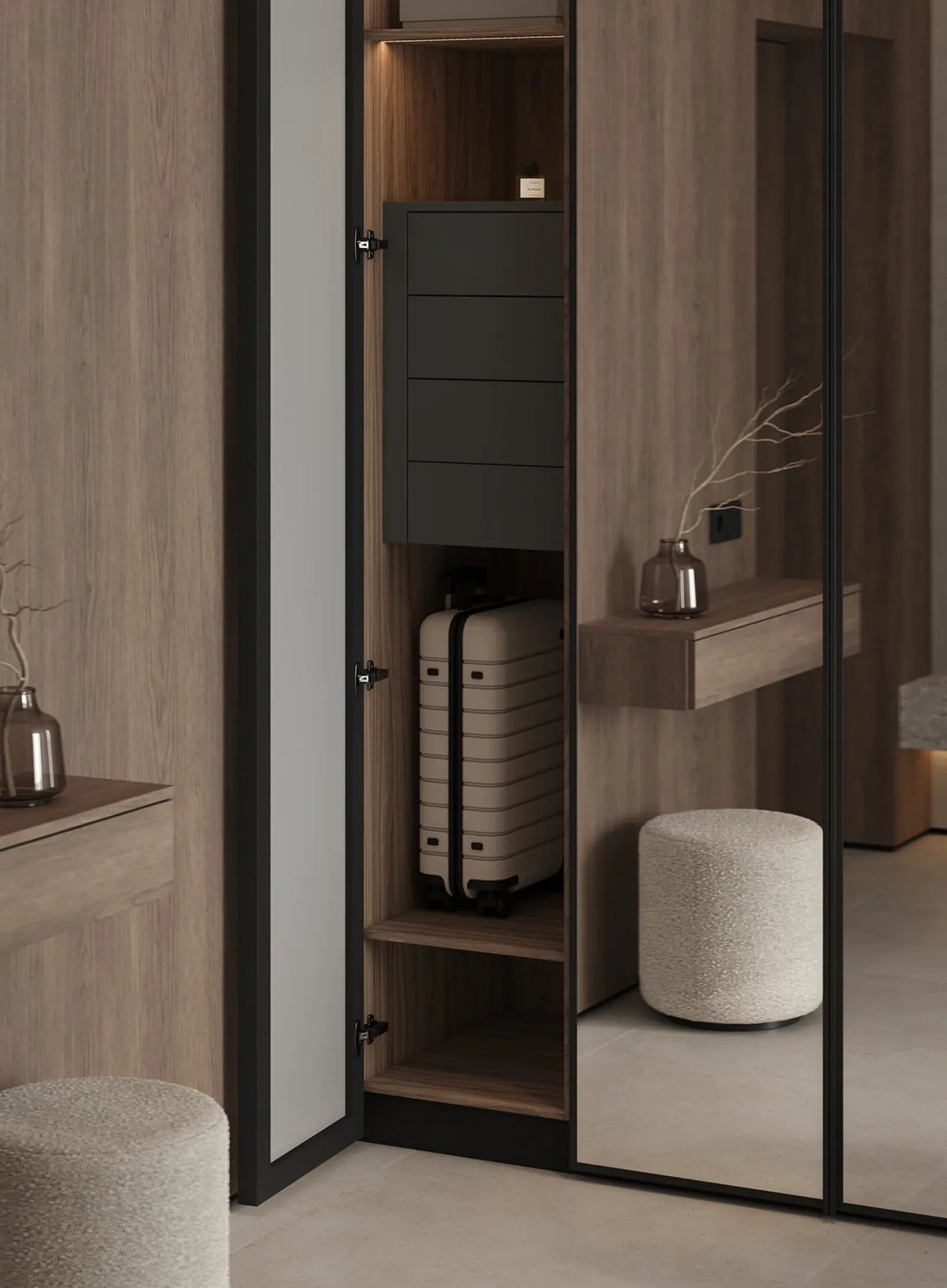 КАРКАС, ПОЛКИ, ВНУТРЕННИЕ ВЫДВИЖНЫЕ ЯЩИКИ, ЗАДНЯЯ СТЕНКА ЛДСП, декор Орех Карини Натуральный / Графит ФАСАДЫ Алюминиевый профиль А - 2 Терра Черная (ручка - профиль С - 5, угол запила 90˚), зеркало