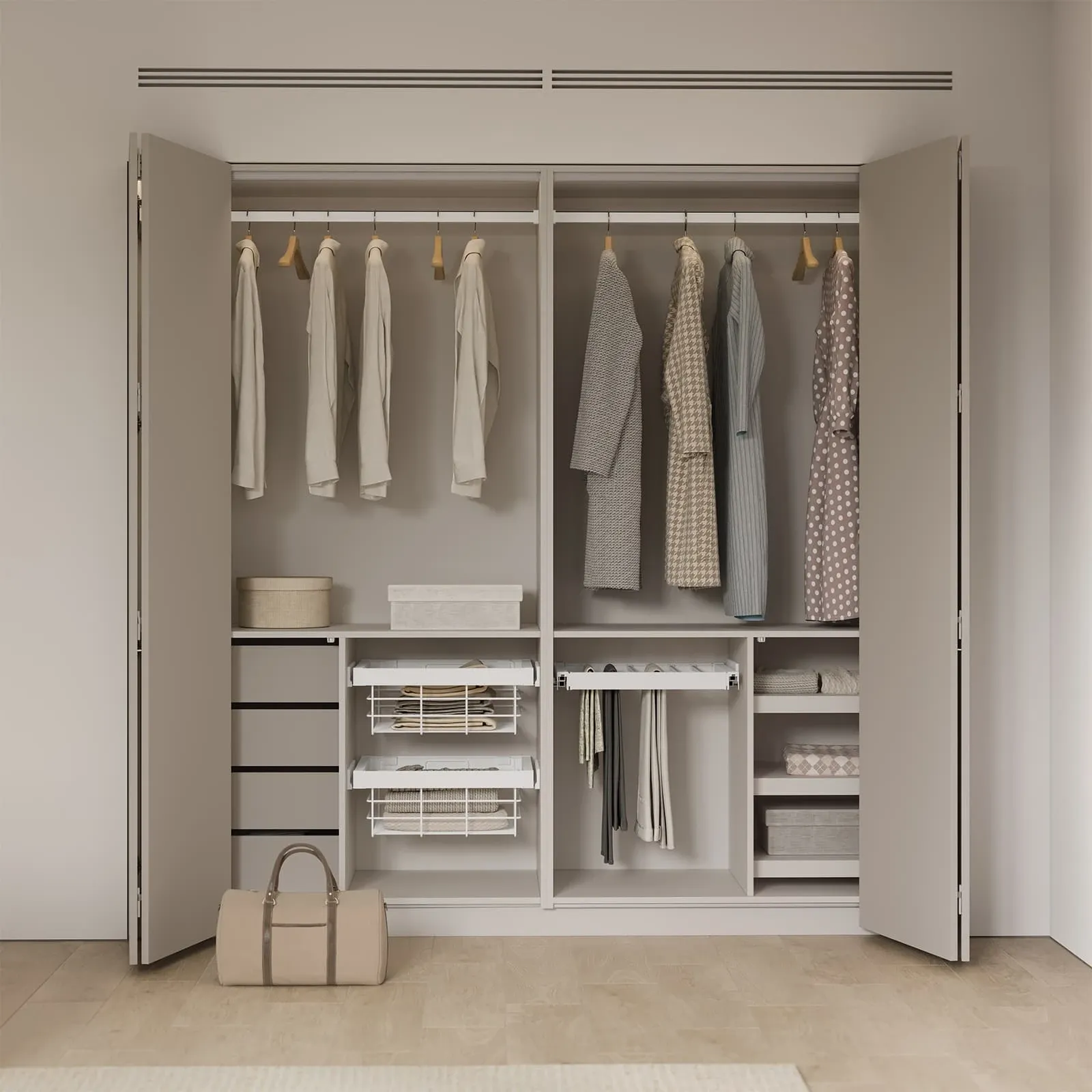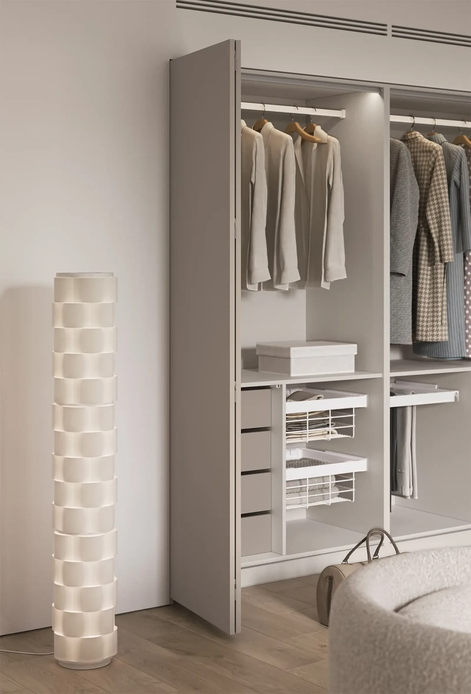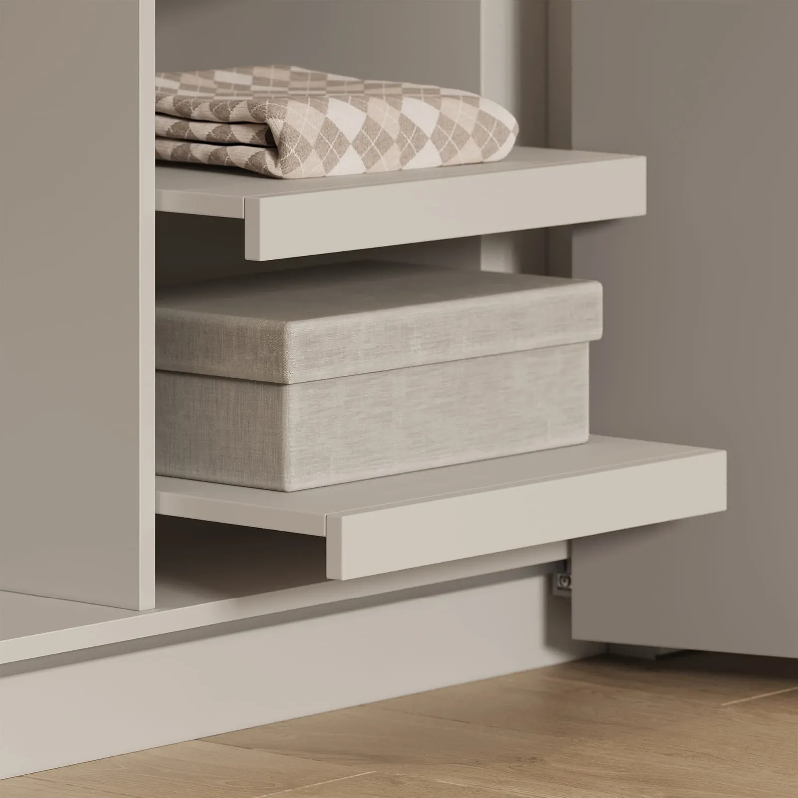 КАРКАС, ПОЛКИ, ЗАДНЯЯ СТЕНКА ЛДСП, цвет Ярко-серый ФАСАДЫ ЛМДФ PRIME, цвет Меринос