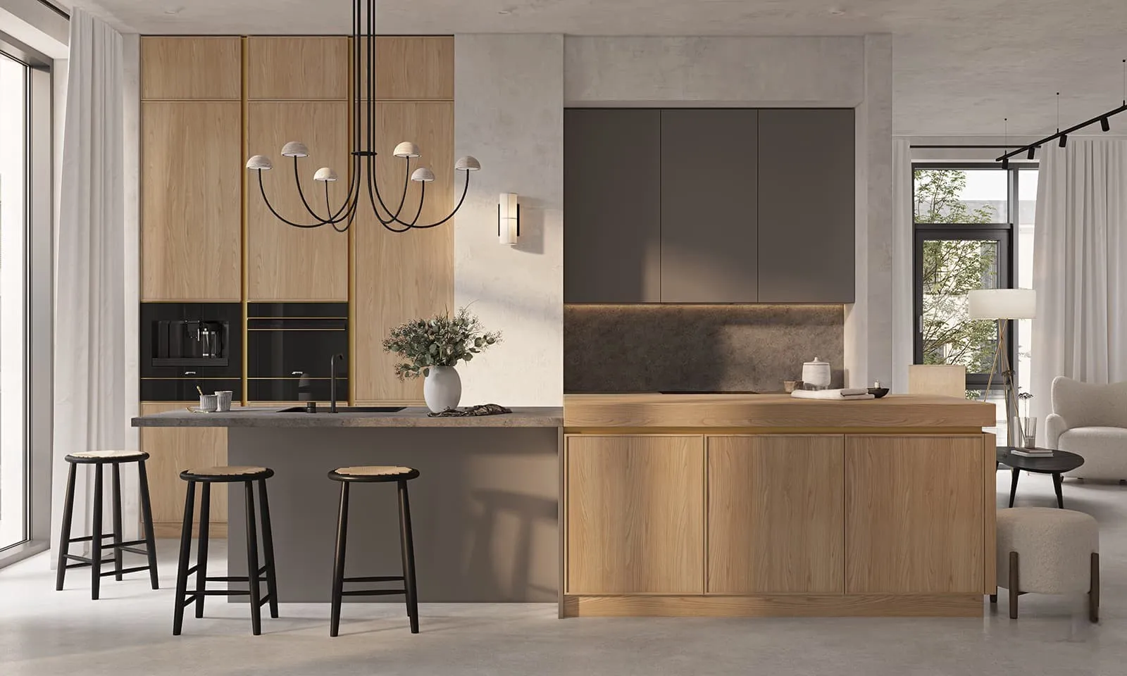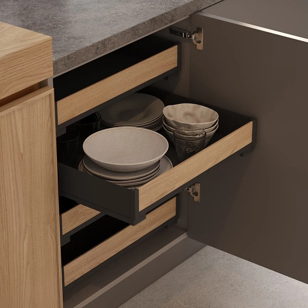 Фасады: T432В Шпон дуба, цвет #182 (масловоск Палисандр) / ЛМДФ, цвет Муссон Супрамат.