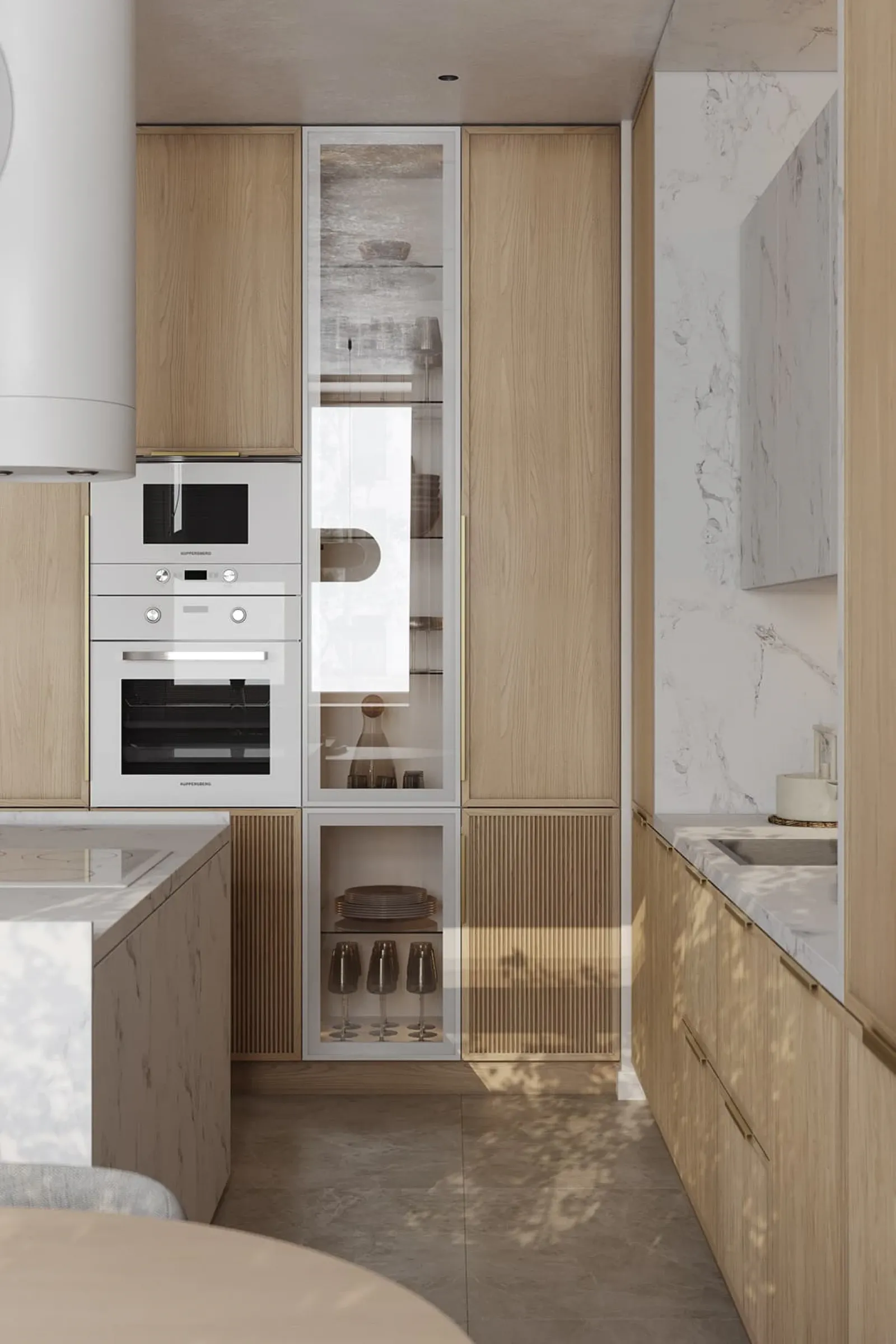 Фасады: Т431В / Т441 Шпон дуба, цвет #183 (масловоск Бесцветный) / пластик HPL Möbius Soft Touch, декор Мрамор Бернини